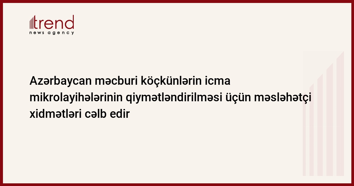Azərbaycanda Məcburi Köçkünlərin Sosial İnkişafı Fondu Dünya Bankının Məcburi Köçkünlərin Həyat Şəraiti və Gəlir İmkanlarının Dəstəklənməsi layihəsi çərçivəsində məsləhətçi xidmətlərinin alınması ilə bağlı tender elan edib. Bu barədə "Xalq qəzeti"ndə dərc olunan məqaləsində bildirilir.