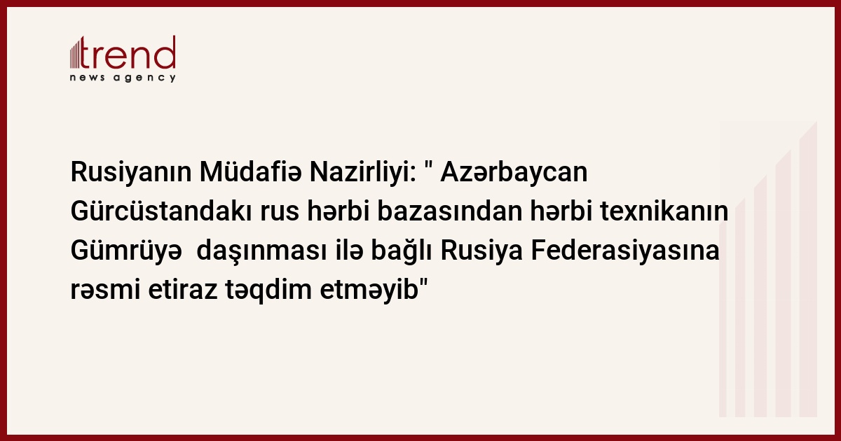 Azərbaycan Gürcüstandakı rus hərbi bazasından hərbi əmlak və texnikanın Gümrüyə (Ermənistan) daşınması ilə bağlı Rusiya Federasiyasına rəsmi etiraz təqdim etməyib. "Qafqaz-pres"in verdiyi məlumata görə, bu barədə Rusiya Federasiyası Silahlı Qüvvələri quru qoşunlarının ictimai əlaqələr və mətbuat xidmətinin rəhbəri, polkovnik German Jitenev bildirib.