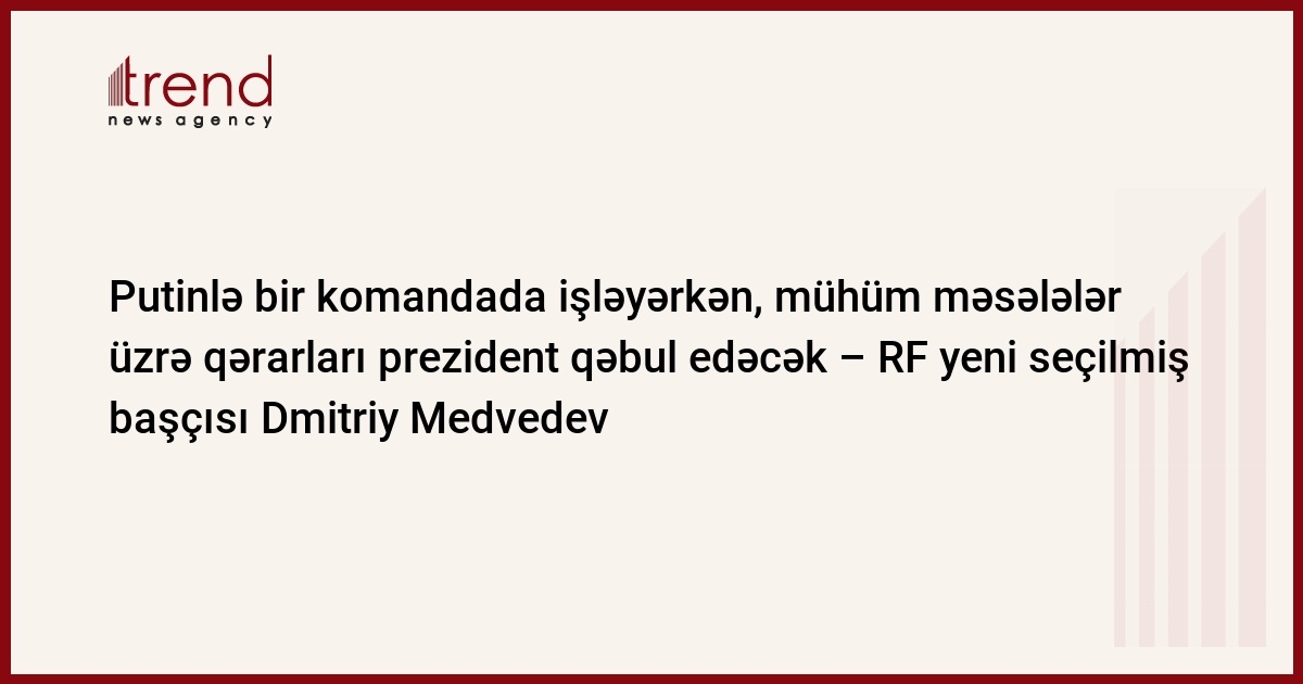 Azərbaycan, Bakı, 25 mart / Trend / Vladimir Putinin başçılığı altında formalaşmış yeni hökümət zamanı, Rusiya Federasiyası daxili və xarici siyasəti ilə bağlı mühüm məsələlər üzrə qərarları ölkənin prezidenti qəbul edəcək. Trend xəbər verdiyi kimi, "Vesti" telekanalının məlumatına görə, bu barədə "The Financial Times" jurnalistinə müsahibəsi zamanı RF yeni seçilmiş prezideni Dmitriy Medvedev bildirib. Sizin hansınız başçı olacaqsınız - indiki RF prezidenti yoxasa RF yeni seçilmiş prezidenti sualına, Medvedev belə cavab verdi, mən bilirəm hansı səbəbə görə bu sual kütləvi informasiya vasitələrində belə çox hallanır.