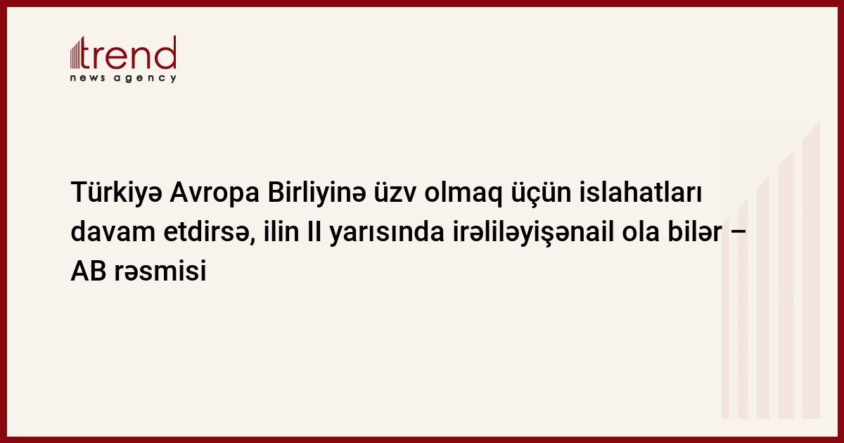Azərbaycan, Bakı, 23 iyun / Trend , müxbir S.İlhamqızı, G.Əhmədova/ Avropa Birliyində hesab edirlər ki, Türkiyə AB-yə daxil olmaq üçün lazımi islahatlarını davam etdirsə, bu ilin ikinci yarısında irəliləyişlər ildə edə bilər. "Əgər Türkiyə lazımi islahatları həyata keçirsə, irəliləyişlər 2008-ci ilin ikinci yarısında da davam edəcək" - deyə Avropa Birliyinin Genişlənmə üzrə Komissiyasının sözçüsü Kristina Nagi Trend -a bildirib.