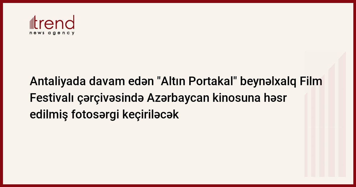 Türkiyə, Ankara, 19 oktyabr / Trend News, müxbir T. Əliyev/ Antaliyada keçirilən 45-ci "Altın Portakal" Film Festivalı və 4-cü Beynəlxalq Avrasiya Film Festivalı çərçivəsində Azərbaycan kinosunun-110 adlı foto sərgi təşkil edilib. TÜRKSOY tərəfindən təşkil edilən sərginin açılışında həmin qurumun Baş direktoru Dusen Kaseinov, Türkitənin Mədəniyyət və Turizm Naziriliyinin nümayəndələri və Altın Portakal Festivalının təşkilatçıları iştirak ediblər.