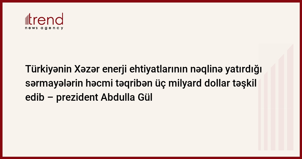 Azərbaycan, Bakı, 14 noyabr/ Trend , müxbir S.Əliyev/ "Türkiyə Xəzər regionundan enerji ehtiyatlarının nəqli layihələrinin reallaşdırılmasına təqribən üç mlrd. dollar yatırıb", - deyə cümə günü Bakıda keçirilən IV Enerji Sammitində Türkiyə prezidenti Abdulla Gül bildirib.