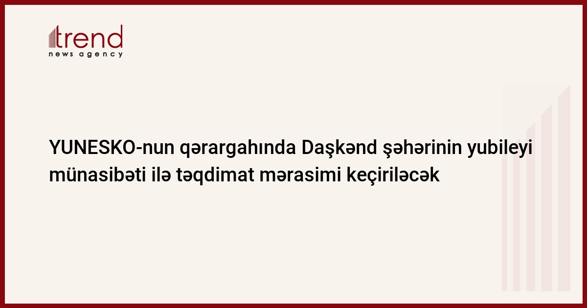 YUNESKO-nun Parisdəki qərargahında aprelin 1-dən 10-na kimi Özbəkistanın paytaxtı Daşkənd şəhərinin yubileyi münasibəti ilə təqdimat mərasimi keçiriləcək, - bu barədə Trend -a Özbəkistanın Mədəniyyət və İdman Nazirliyi məlumat verib.