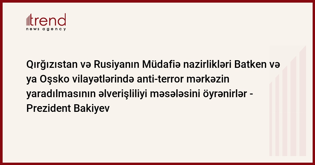 Qırğızıstan və Rusiyanın Müdafiə nazirlikləri Batken və ya Oşsko vilayətlərində anti-terror mərkəzin yaradılmasının əlverişliliyi məsələsini öyrənirlər. Bu barədə Amerikanın nüfuzlu "Nyu-York Tayms" qəzetinə müsahibəsində Qırğızıstan Prezidenti Kurmanbek Bakiyev bildirib, "24 kg" İA xəbər verir.