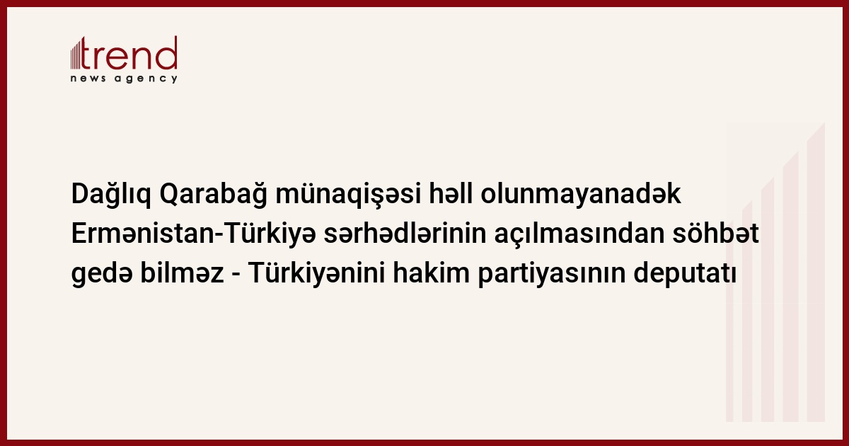Dağlıq Qarabağ münaqişəsi həll olunmayana və Azərbaycanın işğal olunmuş əraziləri azad olunmayanadək Ermənistan-Türkiyə sərhədlərinin açılmasından söhbət gedə bilməz. Bu barədə Türkiyənin hakim Ədalət və İnkişaf Partiyasının deputatı Ömər Çelik deyib. Məlumatı TRT 3 telekanalı yayıb.