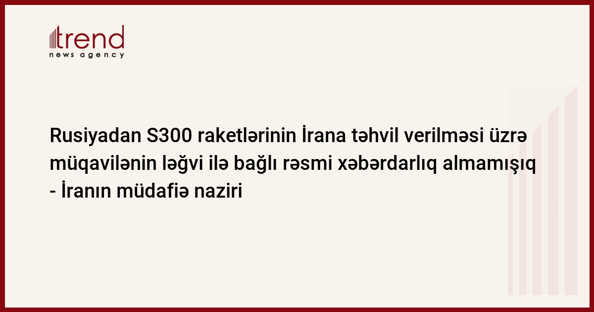 İranın müdafiə naziri Əhməd Vəhidi Rusiyanın S300 raketdən müdafiə sistemini İrana təqdim etməsi üzrə müqavilə haqda yayılan ziddiyyətli xəbərlərə münasibət bildirərək deyib ki, indiyədək Rusiya tərəfindən bu müqavilənin ləğvi ilə bağlı rəsmi xəbərdarlıq alınmayıb. Bu barədə İRNA xəbər agentliyi məlumat yayıb.