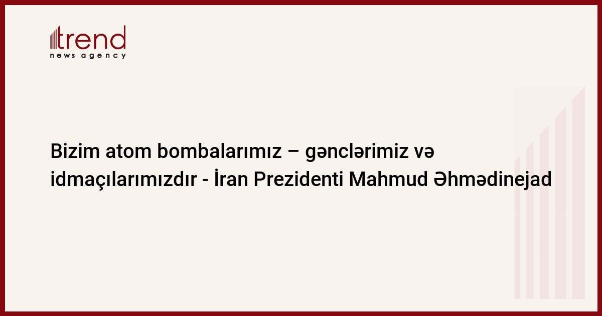 "Mən artıq dəfələrlə bildirmişəm ki, bizim atom bombalarımız - bizim gənclərimiz və idmançılarımızdır. Qətiyyət, intellekt və mədəniyyətə malik olan ölkələrə atom bombası lazım deyil". - Cümə axşamı prezident Əhmədinejad bildirib.