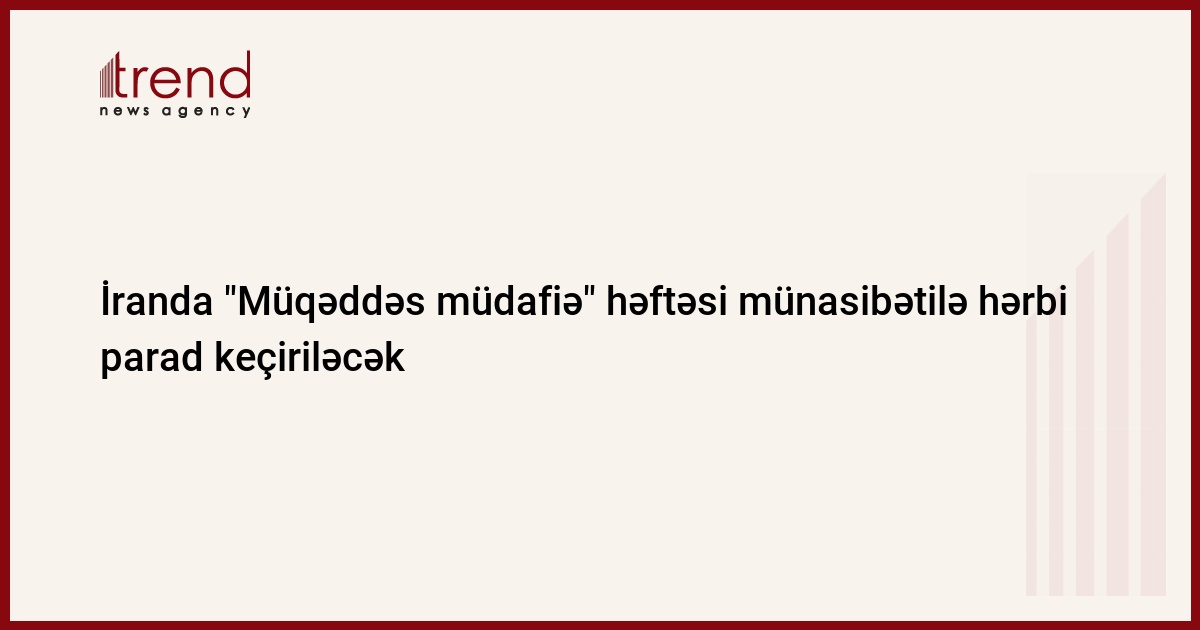 İranda "Müqəddəs müdafiə" həftəsi münasibətilə sentyabrın 22-də hərbi parad keçiriləcək. Hərbi paradda İran Silahlı Qüvvələrinin bütün bölmələri, "Sepah" korpusu qüvvələri, Quru Qoşunları və Hərbi Hava Qüvvələri iştirak edəcəklər. Bu barədə İranın FARS xəbər agentliyi məlumat yayıb.