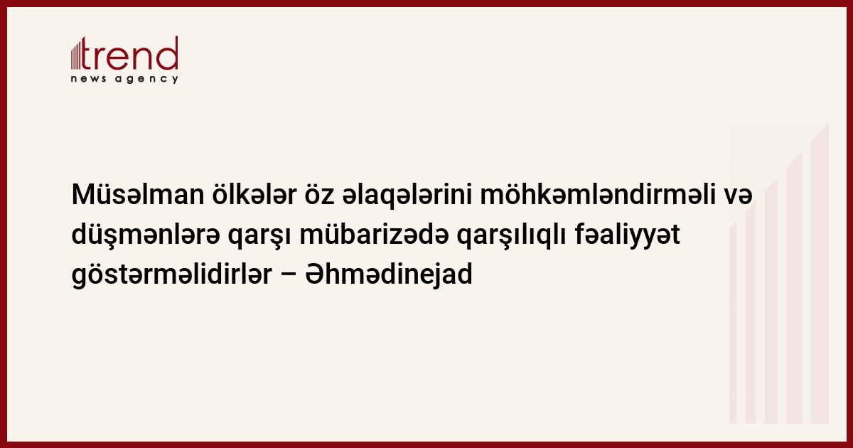 "Müsəlman ölkələri bundan sonra da öz əlaqələrini möhkəmlətməli və düşmənlərin qəsdləri ilə mübarizədə qarşılıqlı fəaliyyət göstərməlidirlər". Əhmədinejad bu fikri Nyu-Yorkda Mavritaniya Baş naziri Mülayə uld Məhəmməd Laqdafla görüşdə səsləndirib.