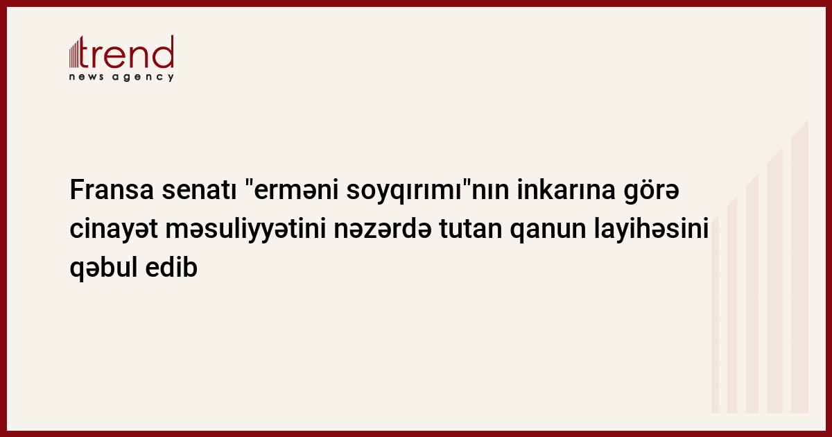 Bu gün Fransa senatı "erməni soyqırımı"nın inkarına görə cinayət məsuliyyətini nəzərdə tutan qanun layihəsini 127 səslə qəbul edib. Trendin məlumatına görə, bu haqda Türkiyənin TRT Haber telekanalı məlumat verib.