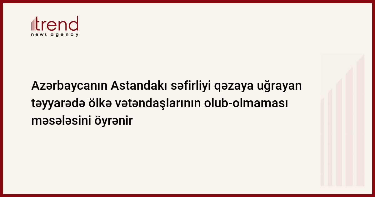 Azərbaycanın Astanadakı səfirliyi Qazaxıstanda qəzaya uğrayan təyyarədə ölkə vətəndaşlarının olub-olmaması məsələsini öyrənir. Bu barədə Trend-ə səfirlikdən məlumat verilib.
