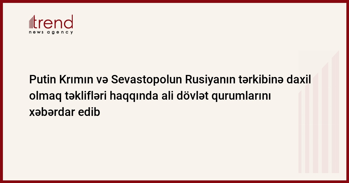 Məlumatda deyilir: "Putin RF Federasiya Şurasını Krım Respublikasının Dövlət Şurasının və Sevastopol şəhərinin Qanunvericilik Məclisinin Sevastopol şəhəri də daxil olmaqla Rusiyanın tərkibinə daxil edilməsi və RF tərkibində yeni subyektlərin yaradılması haqqında xəbərdar edib".