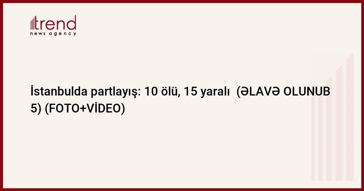 Türkiyə hakimiyyəti İstanbulda partlayış nəticəsində 10 nəfərin öldüyünü təsdiq edib. Bu barədə Trend "TRT Haber" telekanalına istinadən məlumat verir. Telekanalın məlumatına əsasən, partlayış nəticəsində 15 nəfər yaralanıb.