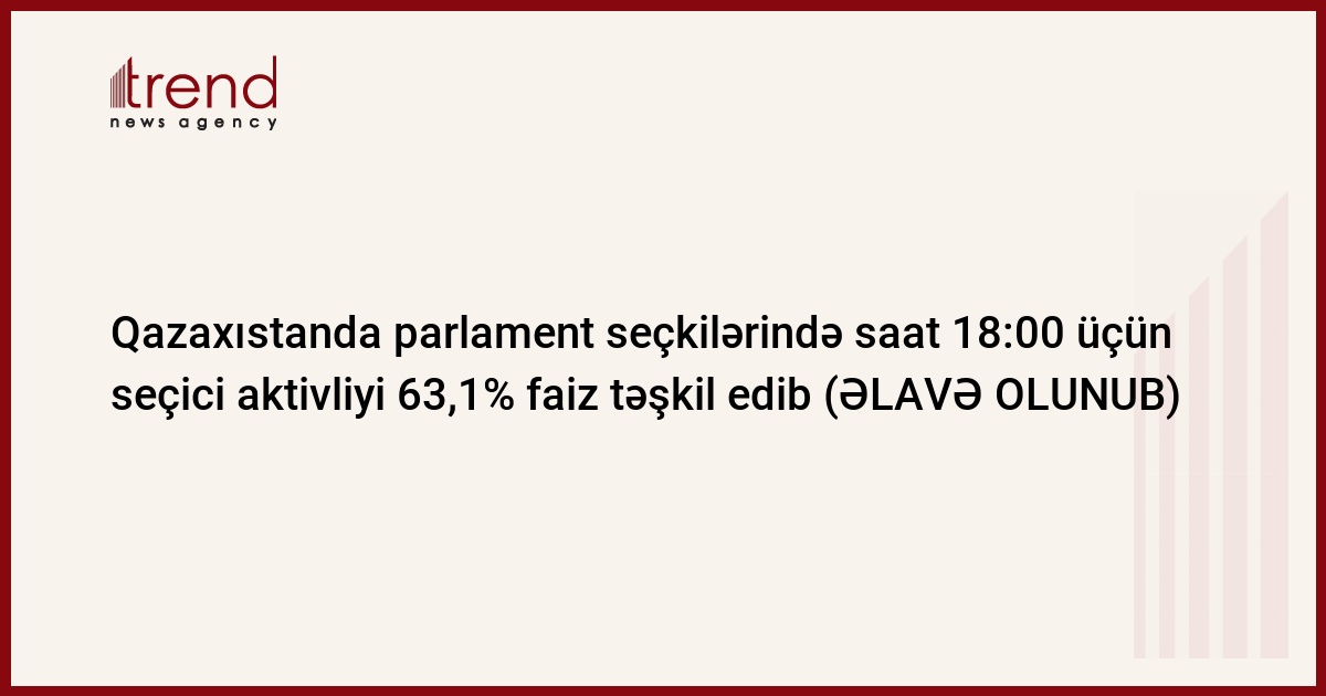 Qazaxıstanda keçirilən parlament seçkilərində yerli vaxtla saat 20:00 üçün (Bakı vaxtilə saat 18:00) seçici aktivliyi 63,1 faiz təşkil edib.