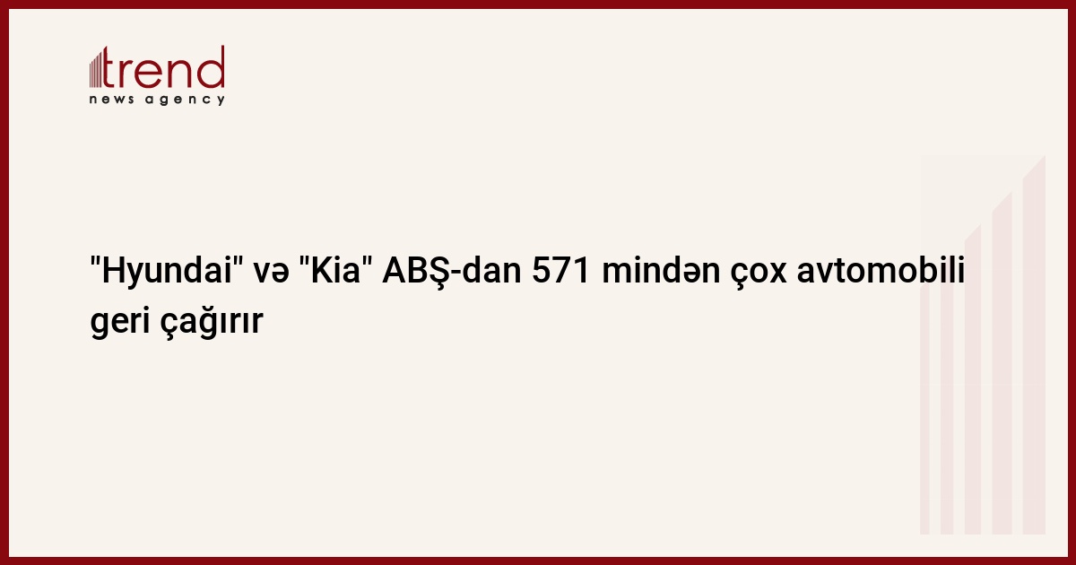 Cənubi Koreyanın avtomobil istehsalçıları "Hyundai" və "Kia" yanğın təhlükəsi səbəbindən ABŞ-dan 571 mindən çox yolsuzluq avtomobili və mikroavtobusu geri çağırır.