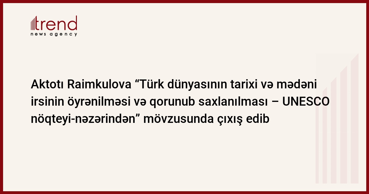 Türk Mədəniyyəti və İrsi Fondunun prezidenti Aktotı Raimkulova nitqində ötən il noyabrın 3-də keçirilən Türk Dövlətləri Təşkilatının Astana Zirvə toplantısında qəbul olunan TURKTIME strateji inkişaf proqramı çərçivəsində Fondun fəaliyyətlərindən söz açıb. Aktotı Raimkulova rəhbərlik etdiyi təşkilat tərəfindən Türk xalqlarının maddi və qeyri-maddi mədəni irsinin mühafizəsi və bərpası üçün hüquqi bazanın – Türk Mədəni İrsi Konvensiyasının hazırlandığını, həmçinin Türk İrsi üzrə Rəqəmsal Platformanın yaradılması istiqamətində addımların atıldığını vurğulayıb.