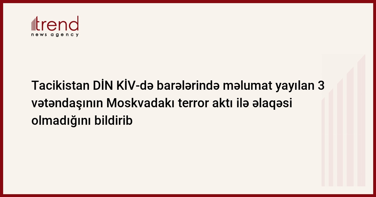 "Crocus City Hall"da törədilən terror aktından sonra "Telegram" kanallarında barələrində məlumat yayılan 3 Tacikistan vətəndaşının törədilən cinayətlə əlaqəsi yoxdur.
