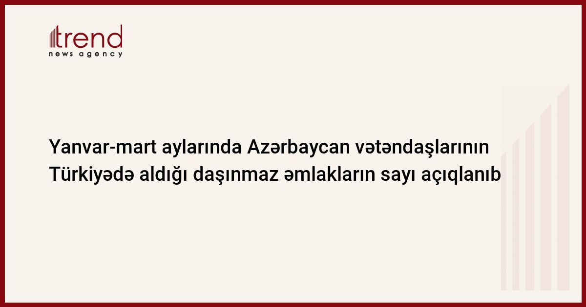 2024-cü ilin yanvar-mart aylarında Azərbaycan vətəndaşları Türkiyədə 169 daşınmaz əmlak satın alıblar ki, bu da keçən ilin eyni dövrü ilə müqayisədə 38 obyekt azdır.