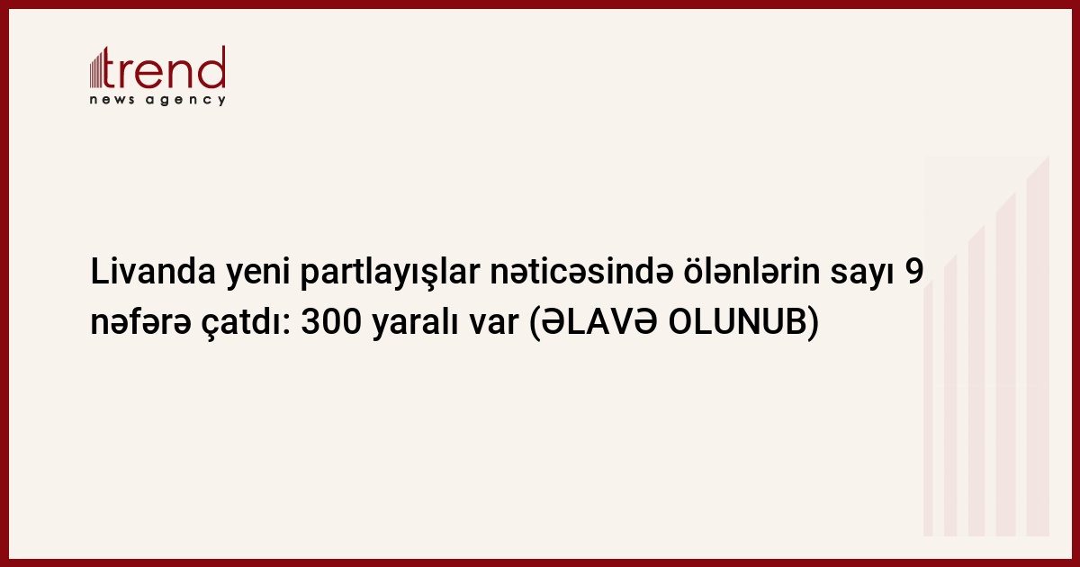 Livanda rabitə cihazlarında baş verən yeni partlayışlar nəticəsində ölənlərin sayı 9 nəfərə çatıb, 300-dən çox insanın yaralandığı bildirilir.