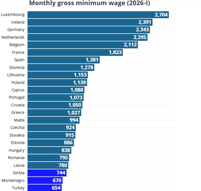 Məsələn, minimum əməkhaqqı Çexiyada 924 avro, Macarıstanda 838 avro, Rumıniyada 795 avro, Türkiyədə 654 avro, Albaniyada isə 517 avro təşkil edir. Üç namizəd ölkədə minimum əməkhaqqı Bolqarıstandakından daha yüksəkdir.