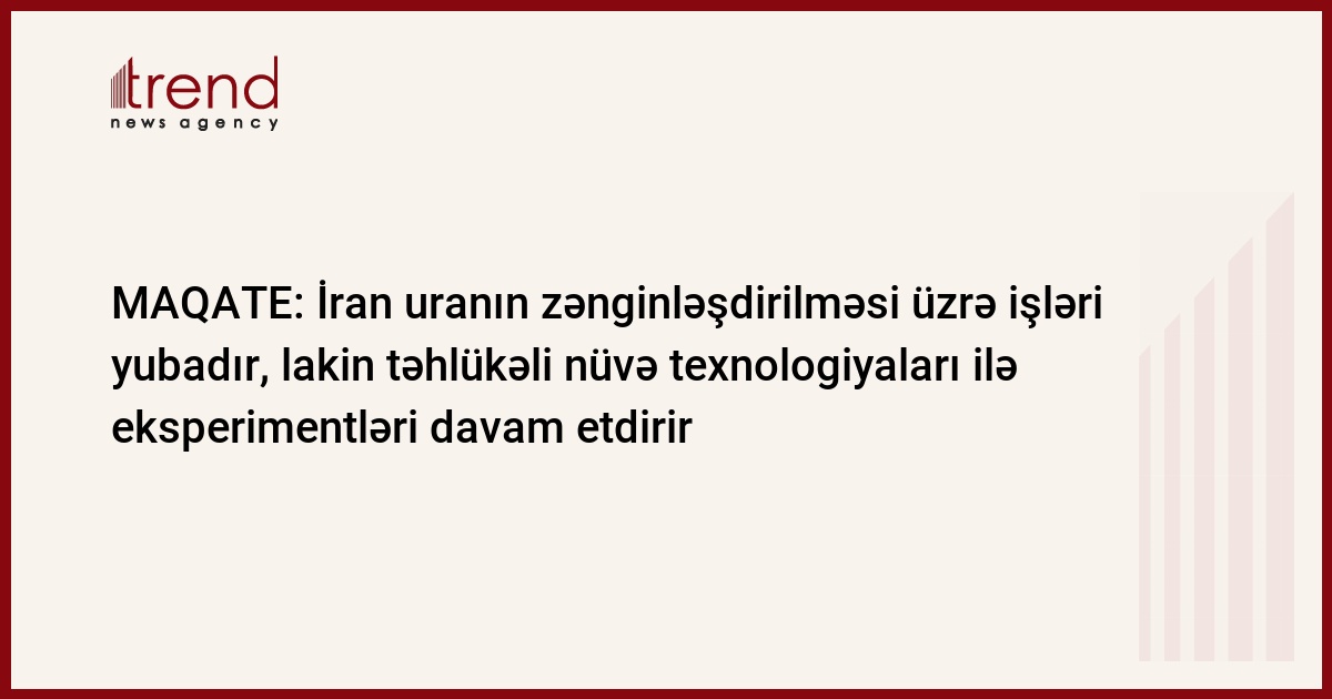 İran uranın zənginləşdirilməsi üzrə işləri bir qədər yubadır, lakin nüvə silahının yaradılması üçün istifadə oluna biləcək təhlükəli texnologiyalar ilə eksperimentləri davam etdirir. Bu məlumatlar Atom enerjisi üzrə beynəlxalq agentliyin (MAQATE) hazırladığı məruzədə var. (C) Associated Press-in verdiyi xəbərə görə, bu gün təşkilatın 35 üzv ölkəsi arasında yayılmış məruzədə həmçinin qeyd olunur ki, BMT müfəttişləri də İranın əvvəllər müstəsna olaraq dinc nüvə tədqiqatları ilə məşğul olması barədə inandırıcı sübut tapa bilmədilər.
