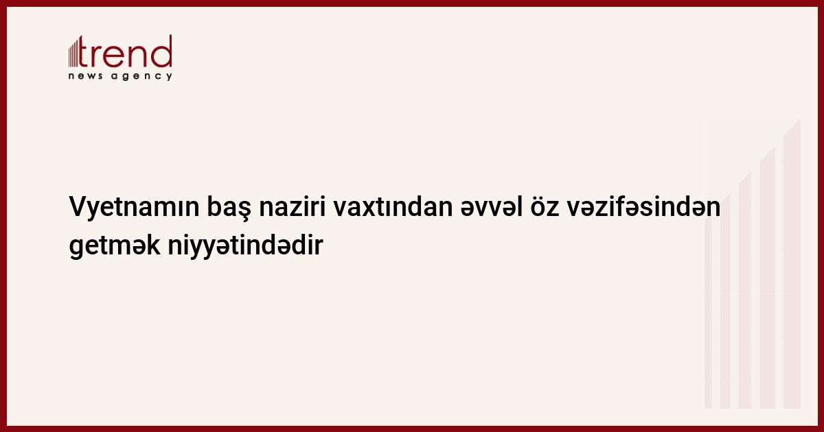 "Associated Press" agentliyi xəbər verir ki, Vyetnamın baş naziri Fan Van Kxay vəzifəsindən azad edilmək xahişilə Milli Assambleyaya müraciət edib. "Mən Milli Assambleyadan xahiş edirəm ki, mənə vaxtından əvvəl baş nazir vəzifəsini tərk etməyə icazə versin" - deyə 72 yaşlı F.V.Kxay milli televiziyaya müsahibəsində bəyan edib. Onun vəzifə müddəti 2007-ci ilin iylunda başa çatır. Trend agentliyinin "RBK"ya istinadən yaydığı məlumata əsasən, bu bəyanat Vyetnamın siyasi həyatında gözlənilməz dönüş olmayıb, çünki F.V.Kxay 2006-cı ilin aprelində ölkənin siyasi bürosuna təkrar seçilməyib.