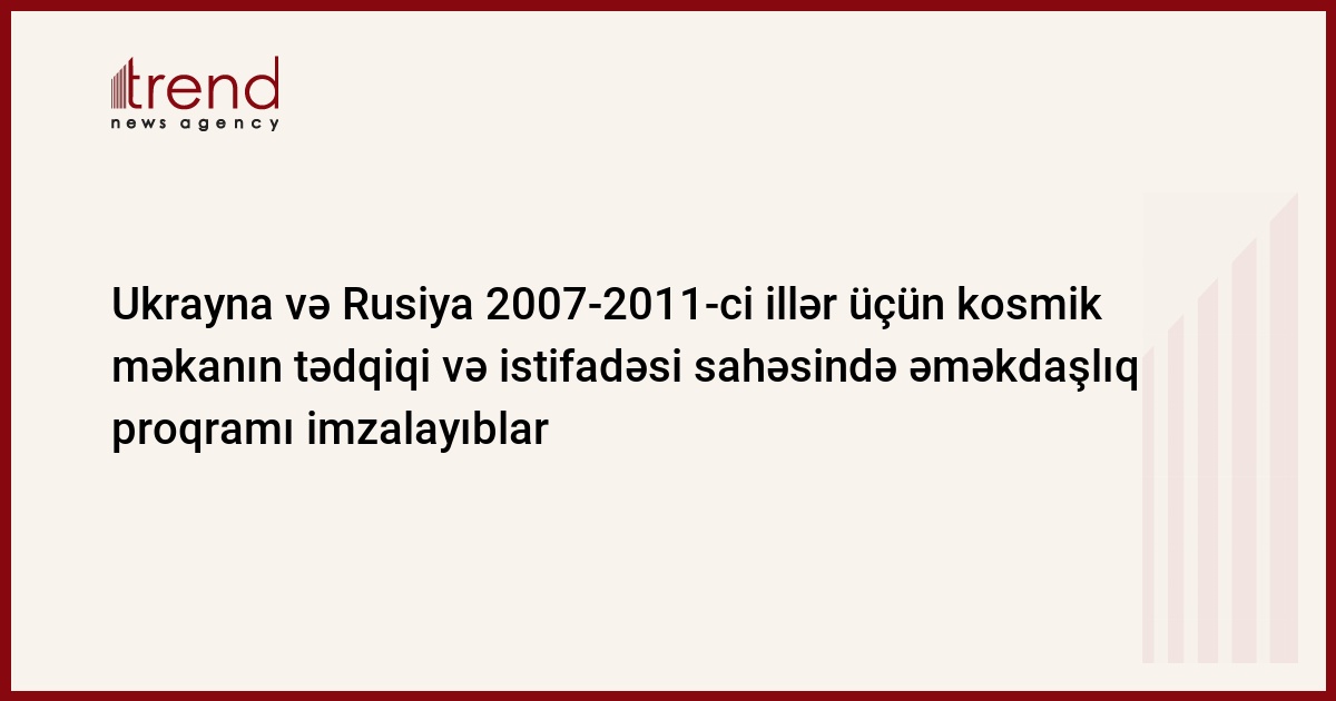 Ukrayna və Rusiya 2007-2011-ci illər üçün kosmik məkanın tədqiqi və istifadəsi sahəsində əməkdaşlıq proqramı imzalayıb. Bu barədə Ukrayna hökümətinin portalında qeyd olunub. Orada göstərilib ki, müvafiq sənədi kosmik agentliklərin rəhbərləri Yuri Alekseyev və Anatoli Perminov imzalayıb.