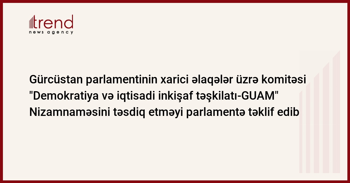 Gürcüstan parlamentinin xarici əlaqələr üzrə komitəsi bu gün "Demokratiya və iqtisadi inkişaf təşkilatı-GUAM Nizamnaməsi" layihəsinin təsdiqini dəstəkləyib. Komitənin rəyində qeyd olunduğu kimi, bu təşkilat mayın 22-23-də Kiyevdə 4 dövlət - Gürcüstan, Ukrayna, Azərbaycan və Moldova tərəfindən yaradılıb.