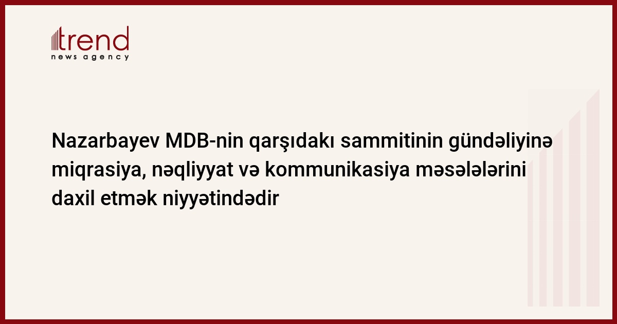 Qazaxıstan prezidenti Nursultan Nazarbayev MDB-nin qarşıdakı sammitinin gündəliyinə miqrasiya, nəqliyyat və kommunikasiya məsələlərini daxil etmək niyyətindədir. Bu barədə o, sentyabrın 21-də MDB-nin vergi (maliyyə) araşdırmaları orqanları rəhbərlərinin koordinasiya şurasının üzvləri ilə görüşdə bildirib. Bu barədə Trend İTAR-TASS-a istinadən xəbər verir.