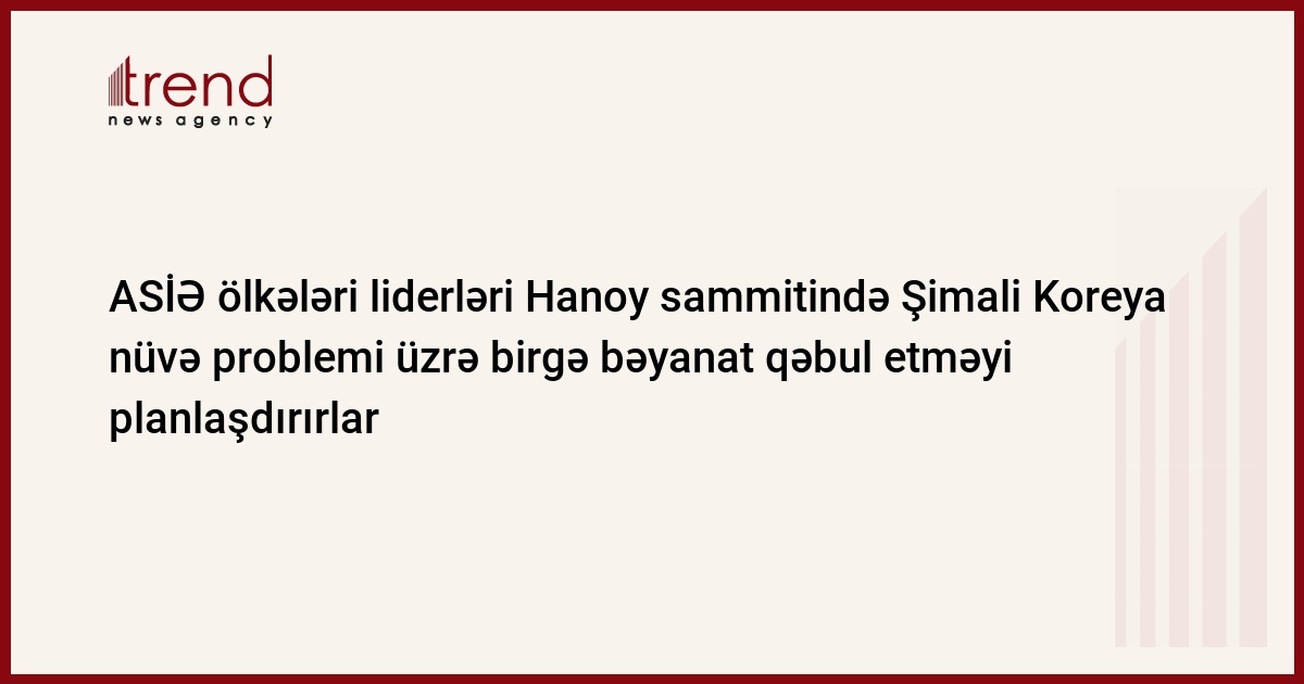 Asiya-Sakit okean iqtisadi əməkdaşlıq (ASİƏ) ölkələri liderləri bu gün Hanoyda açılan sammitdə Şimali Koreya nüvə problemi üzrə birgə bəyanat qəbul etməyi planlaşdırırlar. Bəyanatın yayılmış layihəsində bu ilin iyul ayında KXDR tərəfindən keçirilmiş raket buraxılışları və bu ilin oktyabr ayında həyata keçirilmiş yeraltı nüvə sınaqları ilə bağlı "ciddi təşviş" ifadə olunub. Bu barədə Trend RBK-ya istinadən xəbər verir.