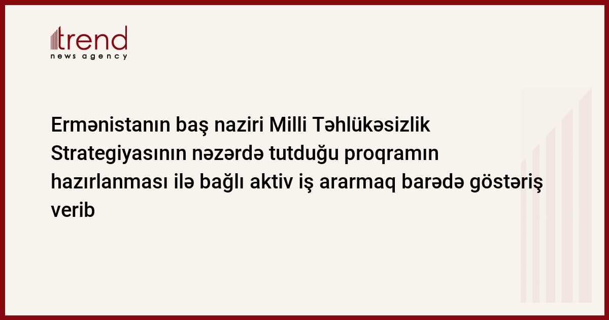 Ermənistanın baş naziri Serj Sarkisyan nazirliklərə Milli Təhlükəsizlik Strategiyasının nəzərdə tutduğu proqramın hazırlanması ilə bağlı aktiv iş ararmaq əmri verib, "Mediamaks" agentliyinin məlumatında bildirilir.